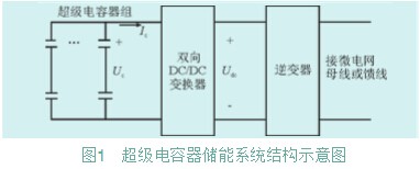 在超級電容器組充放電過程中,端電壓范圍變化大,通常必須采用DC/DC變換器作為接口電路來調(diào)節(jié)超級電容器的儲能和釋能。DC/AC變換器可采用雙向DC/AC逆變器,或者采用AC/DC整流器及DC/AC逆變器。超級電容器儲能系統(tǒng)并聯(lián)在微電網(wǎng)中母線或者饋線上。