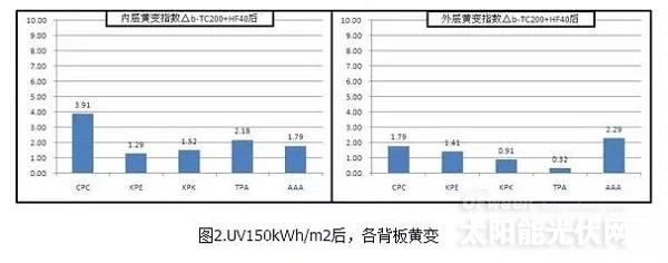 UV150kWh/m2(60℃-試驗箱內(nèi)空氣溫度,輻照度45W/m2):UV試驗時,背板外層對著紫外燈。在UV150kWh/m2后(圖2),涂覆型背板的內(nèi)層和外層均發(fā)生了顯著黃變;個別PVDF膜,如試驗的KPK背板的內(nèi)層PVDF層,也發(fā)生了顯著黃變;而特能(Tedlar)膜和較好的PVDF膜,無明顯黃變;KPE內(nèi)層E層及AAA背板,也無明顯黃變。之所以背板外層對著紫外燈,而背板內(nèi)層仍然發(fā)生黃變,是由于試驗箱中,紫外燈燈管沿箱子一側(cè)的箱壁從上之下依次裝配,背板材料只能也采取外層面向紫外燈管從上至下依次懸掛放置,而背板另一側(cè)的箱壁(不銹鋼制作)會不可避免反射紫外線至背板的內(nèi)層,如此造成背板內(nèi)層黃變現(xiàn)象的發(fā)生。總體而言,加強UV輻照下,涂覆型背板的涂層和一些PVDF膜,容易發(fā)生黃變,特能(Tedlar)膜則表現(xiàn)較好。