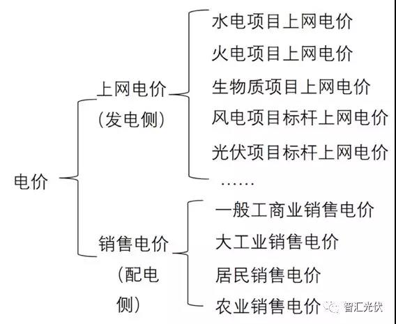 在探討平價上網(wǎng)路徑時,首先要確定平價上網(wǎng)中的“價”是多少。我國現(xiàn)有的電價分類如下圖所示。
