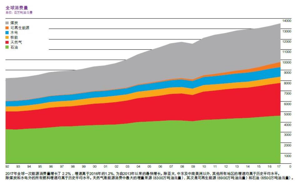 中國的可再生能源發(fā)電增長了2500萬噸油當(dāng)量,打破了此前的增長記錄。不僅如此,如果把2017年所有國家不同能源品種的增量進(jìn)行排序,中國的天然氣和可再生能源將分列第一和第二。