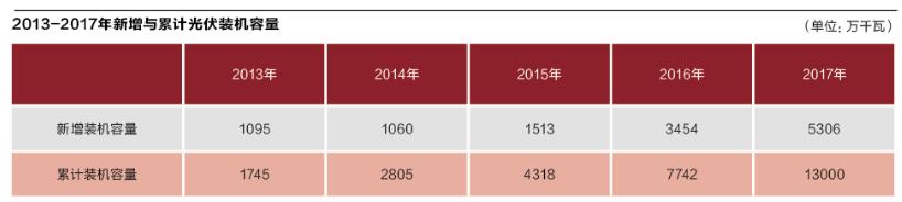 截至2015年底,中國光伏發(fā)電累計裝機(jī)容量4318萬千瓦,問鼎全球光伏發(fā)電裝機(jī)容量最大國家?;仡?017年,中國新增光伏并網(wǎng)裝機(jī)容量達(dá)到53.06GW,同比增長53.6%。累計光伏裝機(jī)并網(wǎng)量達(dá)到130.25GW,同比增長68%。新增和累計裝機(jī)容量均為全球第一。其中,光伏電站累計裝機(jī)容量100.59GW,分布式累計裝機(jī)容量29.66GW。