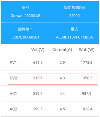 從監(jiān)控界面的電流大小就可以看出,PV2是接的18串3,PV1接的16串2并。PV1的電壓是611.5V,PV2在正常情況下的電壓應(yīng)該是在688V左右,但是實(shí)際PV2的電壓只有315.9V,差了接近372V,所以考慮是組件側(cè)接線出了問題(可能部分發(fā)生短路),需要去現(xiàn)場排查原因。