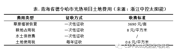 如上圖表所示,以浙江中控太陽(yáng)能在青海德令哈的光熱電站為例,按照上述收費(fèi)標(biāo)準(zhǔn),一個(gè)年發(fā)電量?jī)蓛|度左右的50MW塔式電站,占地面積約3.3平方公里,需要繳納的草原植被恢復(fù)費(fèi)約1800萬(wàn)元,耕地占用稅2700萬(wàn)元,水土保持費(fèi)另算,土地使用稅(按25年期限)可高達(dá)5000萬(wàn)元。若再加上牧民安置等其他費(fèi)用,僅土地一項(xiàng)的支出就已經(jīng)逼近上億元。