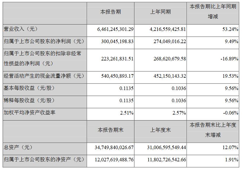 報(bào)告期內(nèi),實(shí)現(xiàn)營(yíng)業(yè)總收入646,124.53萬元,較上年同期增長(zhǎng)53.24%,經(jīng)營(yíng)性現(xiàn)金流量?jī)纛~54,045.09萬元,較上年同期增長(zhǎng)19.53%,歸屬于上市公司股東的凈利潤(rùn)30,004.52萬元,較上年同期增長(zhǎng)9.49%;報(bào)告期末總資產(chǎn)為3,474,984.00萬元,較期初增長(zhǎng)12.07%;歸屬于上市公司股東的凈資產(chǎn)為1,202,761.95萬元,較期初增長(zhǎng)1.91%。