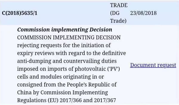 日前,根據(jù)中國機電商會的消息,歐委會已經正式拒絕了歐盟光伏雙反調查申請人EU ProSun關于發(fā)起日落復審的申請,目前的MIP措施和雙反稅將在2018年9月3日到期以后取消,恢復自由貿易。正式的公告已經在歐盟內部排期,預計會在9月3日之前公布。