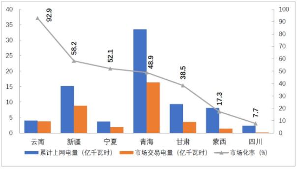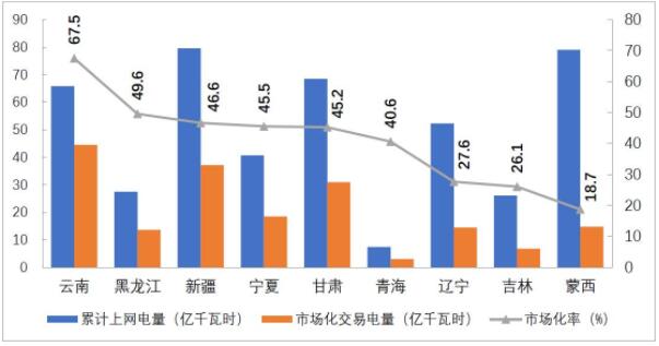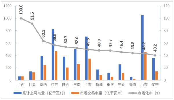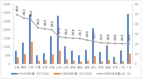 分省來(lái)看,市場(chǎng)交易電量占全社會(huì)用電量比重排序前三名的省份是云南、蒙西和江蘇,分別為49.4%、46.1%、44.5%;電力市場(chǎng)交易電量規(guī)模排序前三名的省份分別為江蘇1286億千瓦時(shí)、山東768億千瓦時(shí)、廣東599億千瓦時(shí);外受電市場(chǎng)交易電量排序前三名的省份分別是江蘇286億千瓦時(shí)、山東242億千瓦時(shí)和浙江160億千瓦時(shí)。
