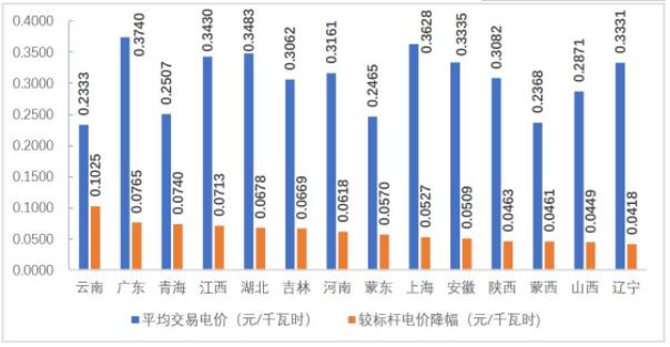 從分省煤電交易價(jià)格來(lái)看,與標(biāo)桿電價(jià)比較降幅最大的是云南,其市場(chǎng)交易平均電價(jià)為0.2333元/千瓦時(shí),與標(biāo)桿電價(jià)相比降幅0.1025元/千瓦時(shí),其次為廣東、青海、江西,其交易平均電價(jià)分別為0.3740元/千瓦時(shí)、0.2507元/千瓦時(shí)、0.3430元/千瓦時(shí),降幅均超過(guò)0.07元/千瓦時(shí)。