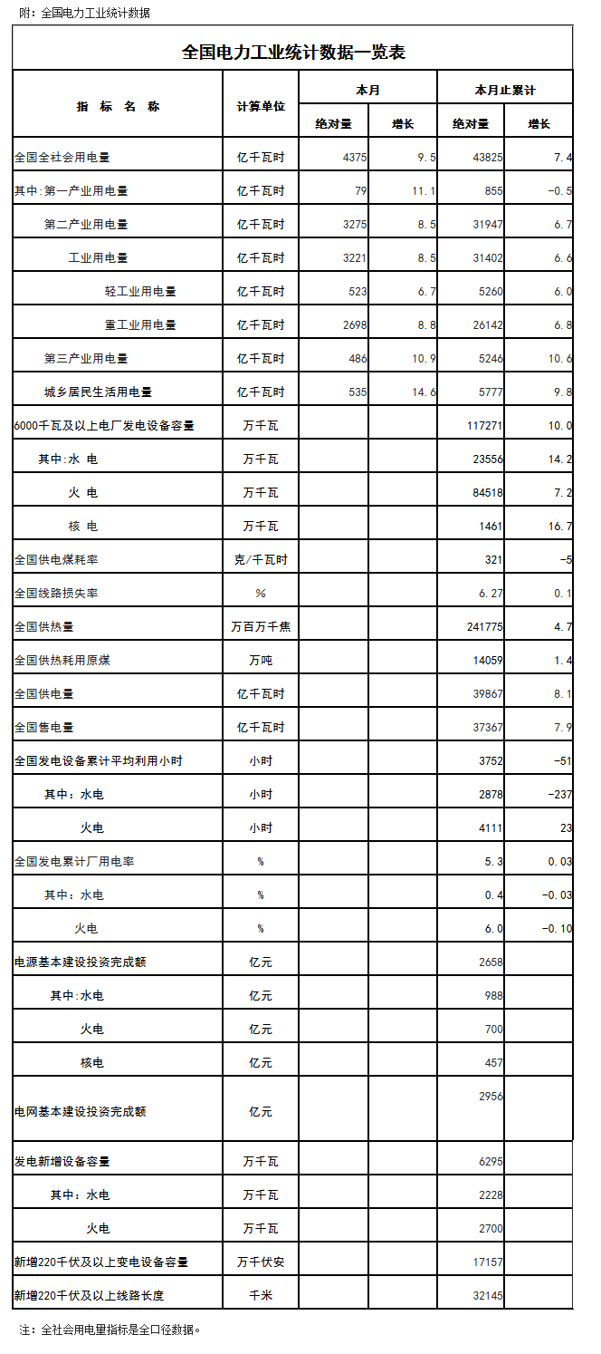 11月14日,國(guó)家能源局發(fā)布10月份全社會(huì)用電量等數(shù)據(jù)。10月份,全社會(huì)用電量4375億千瓦時(shí),同比增長(zhǎng)9.5%。1-10月,全國(guó)全社會(huì)用電量累計(jì)43825億千瓦時(shí),同比增長(zhǎng)7.4%。分產(chǎn)業(yè)看,第一產(chǎn)業(yè)用電量855億千瓦 時(shí),同比下降0.5%;第二產(chǎn)業(yè)用電量31947億千瓦時(shí),增長(zhǎng)6.7%;第三產(chǎn)業(yè)用電量5246億千瓦時(shí),增長(zhǎng)10.6%;城鄉(xiāng)居民生活用電量5777 億千瓦時(shí),增長(zhǎng)9.8%。1-10月,全國(guó)發(fā)電設(shè)備累計(jì)平均利用小時(shí)為3752小時(shí),同比減少51小時(shí)。其中,水電設(shè)備平均利用小時(shí)為2878小時(shí),減少237小時(shí);火電設(shè)備平均利用小時(shí)為4111小時(shí),增加23小時(shí)。從產(chǎn)業(yè)看來(lái),電三產(chǎn)業(yè)用電量呈大幅打上升。