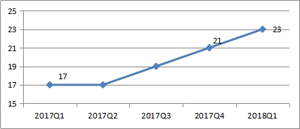 圖表 12017Q1-2018Q1三元材料市場(chǎng)均價(jià)格走勢(shì)(萬(wàn)元/噸)