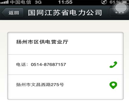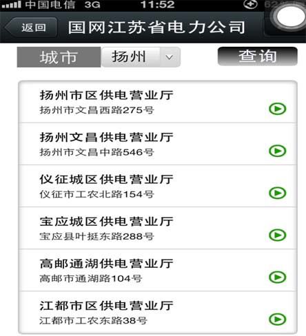 點(diǎn)擊“網(wǎng)點(diǎn)信息”,即會(huì)出現(xiàn)所屬城市的市區(qū)供電營業(yè)廳;點(diǎn)擊每欄右下角的綠色指示箭頭,便會(huì)有此供電營業(yè)廳的電話和地址,方便您進(jìn)行電話直接咨詢。