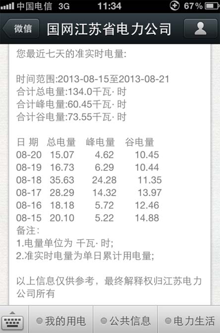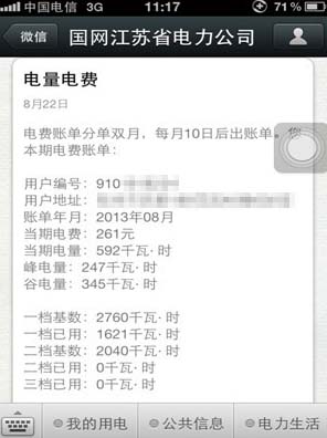 歡迎使用“國網(wǎng)江蘇省電力公司”微信平臺(tái)!您只需下載并安裝“微信”客戶端,并添加公共賬號(hào)“國網(wǎng)江蘇省電力公司”或“sgcc-js”,電費(fèi)賬單查詢、繳費(fèi)記錄查詢、準(zhǔn)實(shí)時(shí)電量查詢、停電信息查詢、營業(yè)網(wǎng)點(diǎn)查詢、用電檔案、服務(wù)資訊、事務(wù)公告等多種便捷服務(wù)業(yè)務(wù)盡在您手掌握。