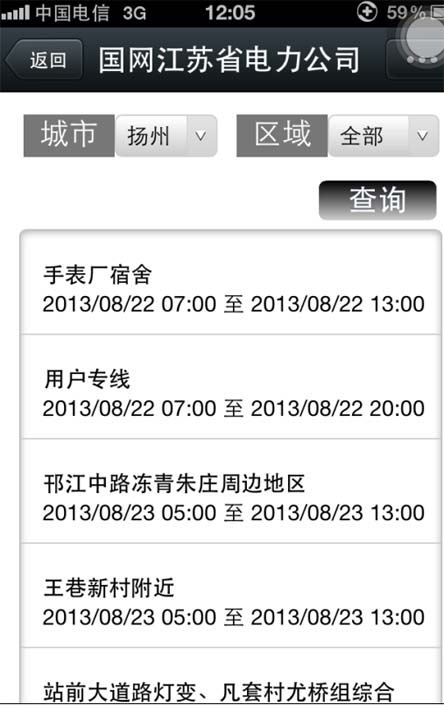 點(diǎn)擊“停電信息”,選擇所在城市與區(qū)域,顯示從選擇日開始的選擇區(qū)域內(nèi)相關(guān)停電信息,方便您及早獲知停電信息。