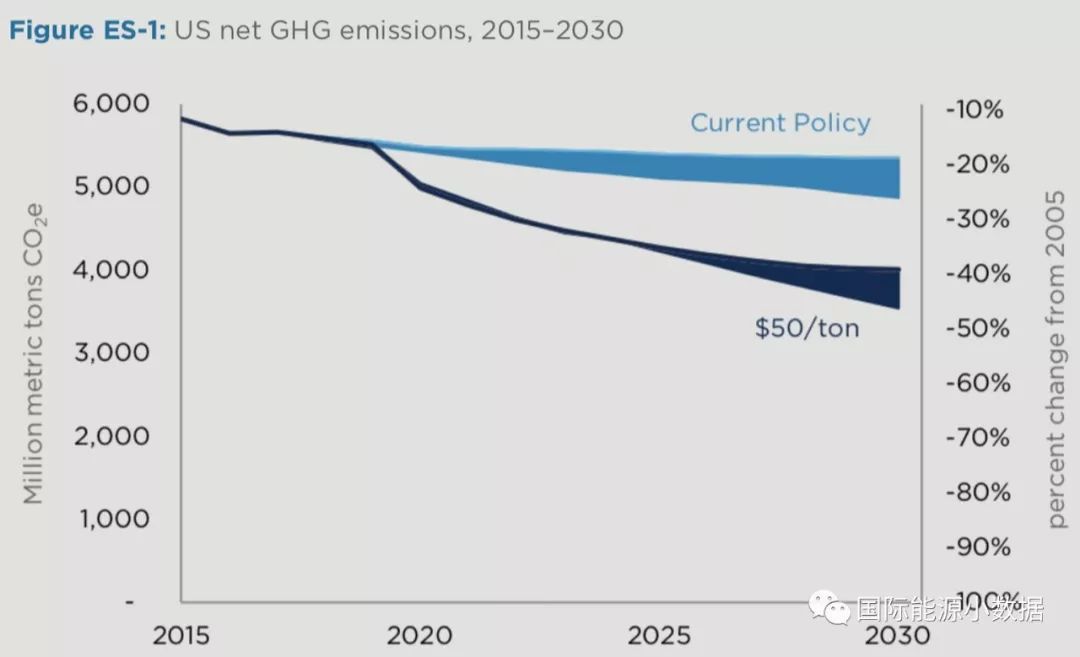 第一,碳稅有助于減排,但是需要達(dá)到較高的碳價(jià)水平才能充分發(fā)揮作用。如果碳稅達(dá)到50美元/噸的時(shí)候,美國2025年代碳排放量將比2005年下降39%-46%(美國奧巴馬政府的減排目標(biāo)是26%-28%)。如果2050年代減排目標(biāo)是比2005年下降80%,那么屆時(shí)碳稅需要超過100美元/噸。