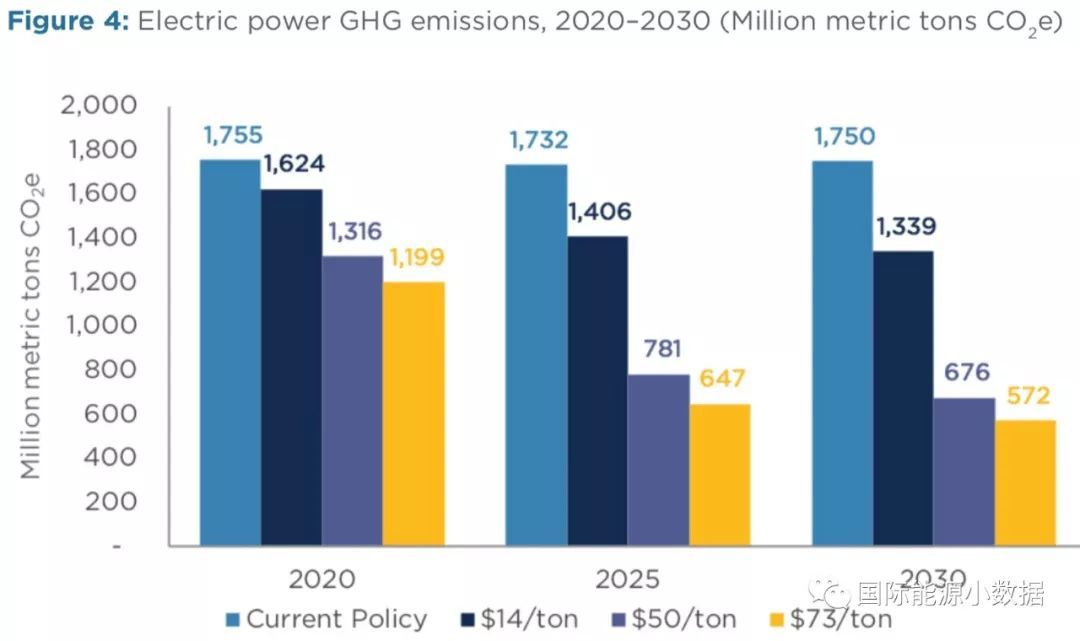 第二,碳稅對(duì)電力部門的煤電廠影響最大(煤電廠加速退役),到2030年因?yàn)樘级悓?shí)現(xiàn)的減排量中80%來自電力部門。如果碳稅為50美元/噸,那么2030年電力部門碳排放為6.76億噸,比沒有碳稅的情境下的排放量降幅達(dá)61%。而50美元/噸的碳稅對(duì)于交通部門的減排量影響非常小(-2%)。
