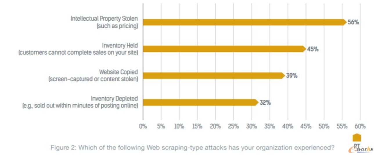 如前所述,計算機(jī)機(jī)器人程序是受訪者需要認(rèn)真對待的關(guān)鍵技術(shù)問題。對那些能夠區(qū)分良性計算機(jī)機(jī)器人程序和不良計算機(jī)機(jī)器人程序的受訪者而言,不良計算機(jī)機(jī)器人程序通常會以Web專區(qū)攻擊的形式攻擊零售商。事實上,75%的零售商稱,Web刮取對他們的知識產(chǎn)權(quán)是一個很大的風(fēng)險。Radware研究指出,72%的零售商都表示遭受了Web抓取攻擊的影響,包括采集報價信息(56%)、凍結(jié)庫存(45%)、網(wǎng)站復(fù)制(39%)和耗盡庫存(32%) (見圖2)。