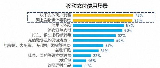 在移動(dòng)支付的使用場景中,商超及餐飲類線下實(shí)體消費(fèi)、網(wǎng)上實(shí)物類消費(fèi)比例最高。