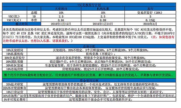 Vsport號稱“用區(qū)塊鏈改造體育產業(yè)“,計劃在1月底完成機構私募,3月上境外交易所,發(fā)幣總額在10億個左右。本輪起投額度為10個比特幣或100個以太幣,按當前兌換比例估計,可以買125萬個VSC幣;如果能按計劃順利募完,以0.12美元的價格在交易所發(fā)行,單個幣就能賺0.04美元,也就是說投資者至少可以賺到5萬美元凈利。