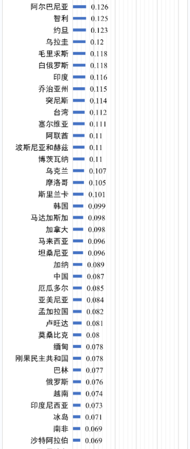 圖2 133個經(jīng)濟(jì)體工商業(yè)用戶平均電價(100萬千瓦時/年用電等級,含稅終端電價,2022年四季度,美元/千瓦時)