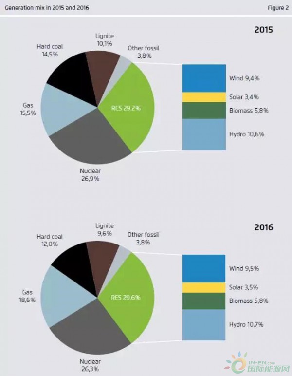 如果把各類可再生能源(水電、風(fēng)電、生物質(zhì)、太陽能)整體計算,2016年在歐盟發(fā)電總量中占比為29.6%,比2015年(29.2%)略有上升,顯示歐盟可再生能源發(fā)展進(jìn)入了瓶頸期。