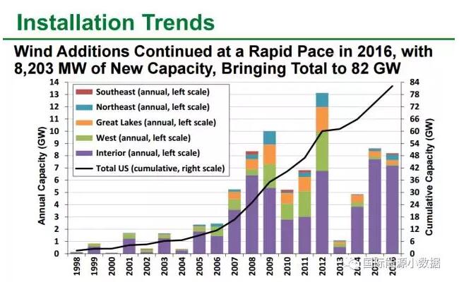 # 2016年美國風(fēng)電投資130億美元,新增風(fēng)電裝機(jī)8.203吉瓦(90%的新增裝機(jī)在美國中部州),占當(dāng)年各類新增電力裝機(jī)總量的27%。在新增裝機(jī)中包括美國首座海上風(fēng)電——30兆瓦羅德島風(fēng)電場。另外有48兆瓦風(fēng)電退役,所以2016年美國凈增風(fēng)電裝機(jī)為82.142吉瓦。