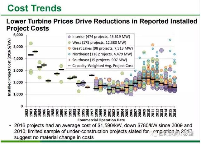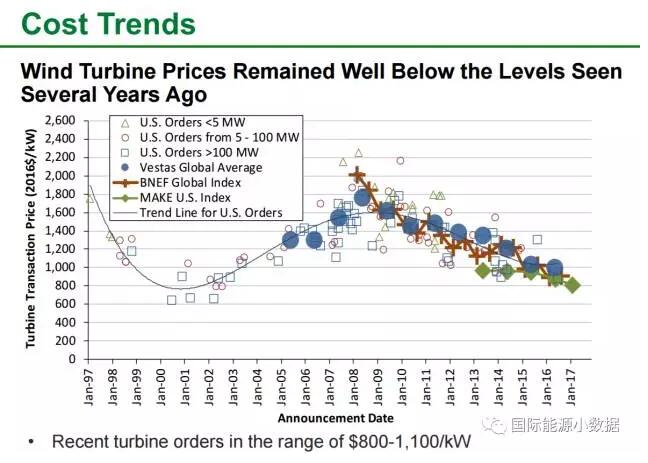 # 2008年以來美國風(fēng)機(jī)價(jià)格明顯下降,目前在800-1100美元/千瓦左右。這樣,一個(gè)2兆瓦的風(fēng)機(jī)售價(jià)在160-220萬美元之間。2016年風(fēng)電系統(tǒng)裝機(jī)成本約為1590美元/千瓦。