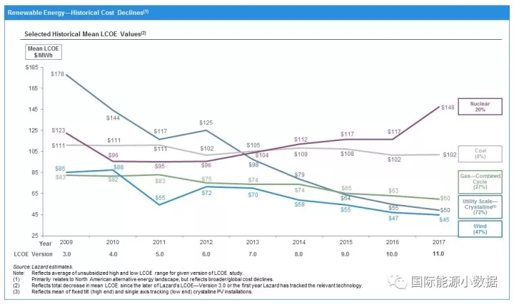 美國LAZARD公司日前發(fā)布一年一度的美國各類發(fā)電技術平準成本(Lazard Levelized Cost of Energy Version 11.0)數(shù)據(jù)。