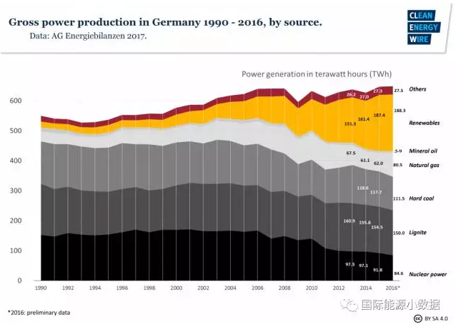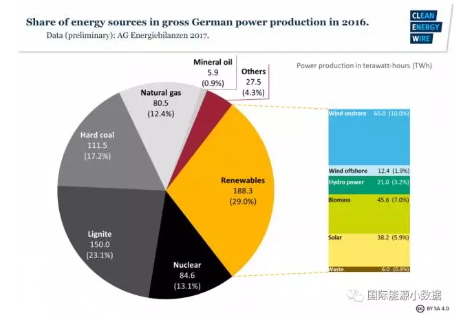從發(fā)電量來(lái)看,2016年德國(guó)發(fā)電量為648.3TWh(6483億千瓦時(shí)),其中核電84.6TWh(13.0%)、褐煤150.0TWh(23.1%)、硬煤111.5TWh(17.2%)、天然氣80.5TWh(12.4%)、礦物油5.9TWh(0.9%)、可再生能源188.3TWh(29.0%)、其他27.5TWh(4.2%)。綜合而言,德國(guó)的可再生能源發(fā)電裝機(jī)占總裝機(jī)容量的53.0%,但發(fā)電量只占53.0%;而煤電裝機(jī)占24.6%,但發(fā)電量占40.3%。