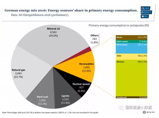 如果看一次能源消費(fèi)(包括交通、供暖需求),那么2016年煤炭占33.6%、核能6.9%、天然氣22.7%、礦物油34.0%、可再生能源12.6%,其他1.8%。