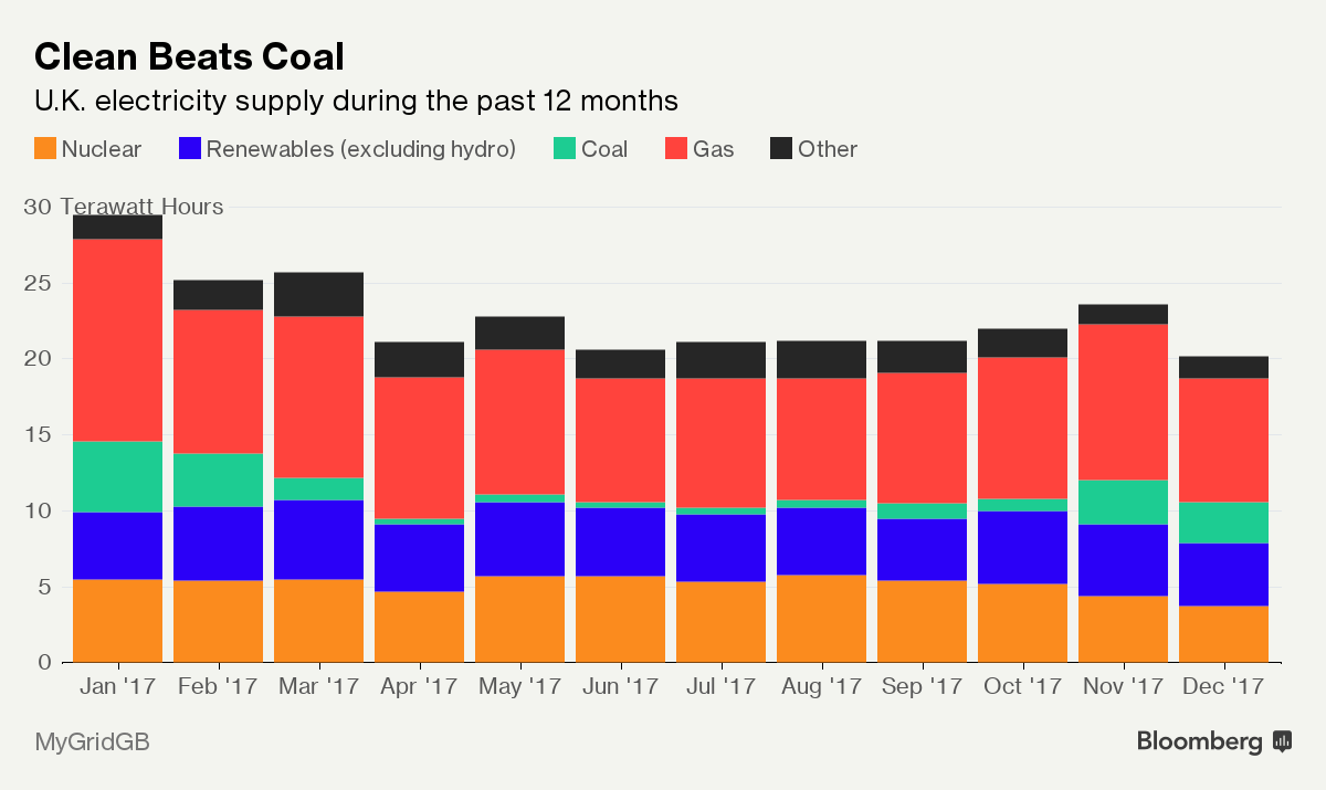 2017年,英國風(fēng)能、太陽能與核能聯(lián)合發(fā)電量首次超過煤炭和天然氣。