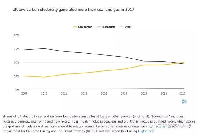 根據(jù)CarbonBrief的初步統(tǒng)計(jì)數(shù)據(jù),2017年英國低碳電源(核電、生物質(zhì)、風(fēng)電、光伏、水電)發(fā)電比例首次超過了50%,而化石能源(天然氣、煤、