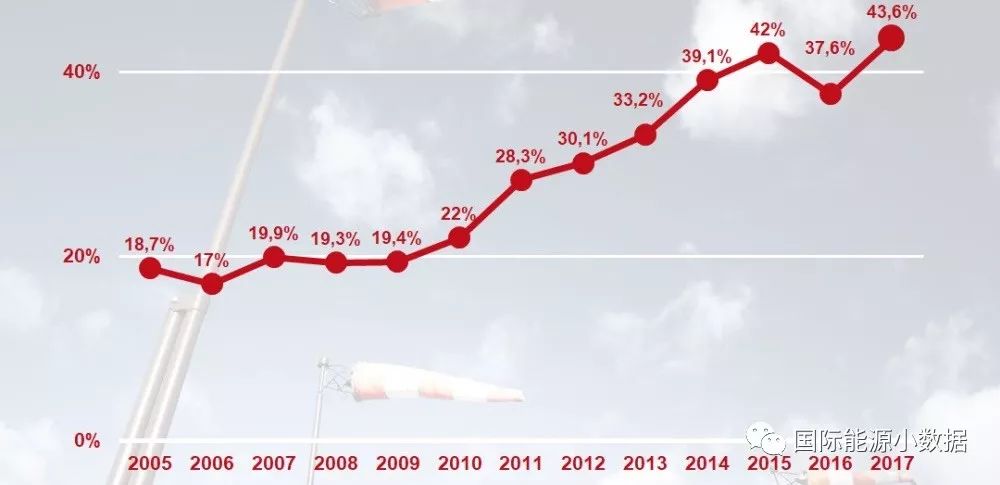 根據(jù)Energinet.dk提供的數(shù)據(jù),2017年底丹麥風(fēng)電裝機達到5.3吉瓦,全年發(fā)電量14.7TWh(147億千瓦時),占全國發(fā)電總量的43.6%,創(chuàng)歷史新高;預(yù)計2020年丹麥風(fēng)電占比將超過50%。