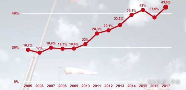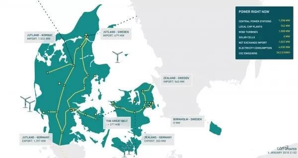 根據(jù)Energinet.dk提供的數(shù)據(jù),2017年底丹麥風(fēng)電裝機(jī)達(dá)到5.3吉瓦,全年發(fā)電量14.7TWh(147億千瓦時(shí)),占全國(guó)發(fā)電總量的43.6%,創(chuàng)歷史新高;預(yù)計(jì)2020年丹麥風(fēng)電占比將超過50%。