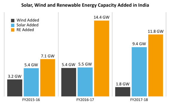 由于風能和屋頂太陽能發(fā)電行業(yè)增速放緩,印度連續(xù)第二年未能實現其可再生能源發(fā)展目標。2017年4月至2018年3月期間,印度聯網可再生能源裝機容量為11.75吉瓦,低于設定的14.45吉瓦的目標。