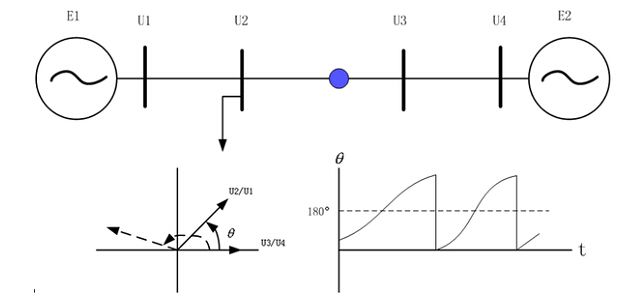 至于失步解列判據(jù),相對比較理論,而且很多方法無法統(tǒng)一,一般采用振蕩中心兩側(cè)母線電壓相量直接比相原理,當(dāng)兩側(cè)母線電壓相位差軌跡超過180度時(shí)認(rèn)為系統(tǒng)失去同步,且振蕩中心在兩個(gè)母線之間。