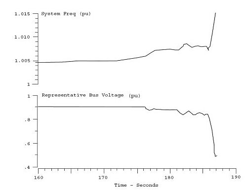 160s后,另外一些發(fā)電機(jī)由于OEL作用而使Qlimit致Qnominal,減少無功輸出,加大了和加速了電壓下降―――發(fā)電機(jī)失步,低壓保護(hù)而失去一些發(fā)電機(jī)。