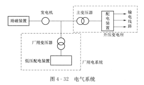 (3)電氣系統(tǒng)。電氣系統(tǒng)如圖4-32所示,包括發(fā)電機(jī)、勵(lì)磁系統(tǒng)、廠用電系統(tǒng)和升壓變電站等。
