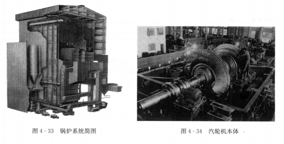 (1)鍋爐本體。鍋爐設(shè)備是火力發(fā)電廠中的主要熱力設(shè)備之一,其系統(tǒng)簡(jiǎn)圖如圖4-33所示。由爐膛、煙道、汽水系統(tǒng)(其中包括受熱面、汽包、聯(lián)箱和連接管道)以及爐墻和構(gòu)架等部分組成的整體,稱為“鍋爐本體”。它的作用是使燃料在爐膛中燃燒放熱,并將熱量傳給工質(zhì),以產(chǎn)生一定壓力和溫度的蒸汽,供汽輪發(fā)電機(jī)組發(fā)電。目前,在我國(guó)大型電廠多用煤粉爐和沸騰爐。電廠鍋爐與其他行業(yè)所用鍋爐相比,具有容量大、參數(shù)高、結(jié)構(gòu)復(fù)雜、自動(dòng)化程度高、熱效率高等特點(diǎn)。電站鍋爐的各項(xiàng)操作基本實(shí)現(xiàn)了機(jī)械化和自動(dòng)化,適應(yīng)負(fù)荷變化的能力很強(qiáng),工業(yè)鍋爐目前僅處于半機(jī)械化向全機(jī)械化發(fā)展的過(guò)程中;電站鍋爐的熱效率在90%以上,工業(yè)鍋爐的熱效率多在60%~80%之間。