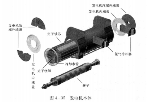 轉(zhuǎn)子由轉(zhuǎn)子本體、護(hù)環(huán)、心環(huán)、轉(zhuǎn)子線圈、滑環(huán)、同軸激磁機(jī)電樞組成,如圖4-35所示。