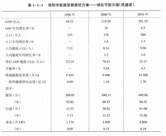 貴陽(yáng)市能源發(fā)展最優(yōu)方案——強(qiáng)化節(jié)能方案低速度見表1-1-1。從表看出,貴陽(yáng)市GDP產(chǎn)值1990-2000年年均增長(zhǎng)率將達(dá)到10 %,2000-2010年達(dá)到8.5%,到2000年GDP產(chǎn)值達(dá)到115億元,到2010年達(dá)到261億元。貴陽(yáng)市一次能源供應(yīng)總量1990年為230萬(wàn)tce,到2000年將增加到390萬(wàn)tce,到2010年增加到572萬(wàn)tce。1990年煤炭、石油、水電在一次能源供應(yīng)構(gòu)成中分別為91.23%、8.74%、0.03%,到2000年為88.53%、11.32%、0.15%,到2010年為84.32%、15.49%、0.19 %,
