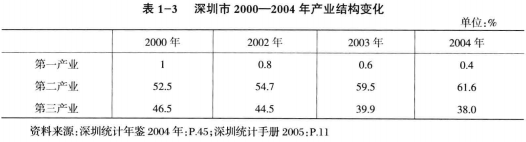 從表1-3可以看出,2000-2004年,深圳市產(chǎn)業(yè)結(jié)構(gòu)在逐步變化。第一產(chǎn)業(yè)和第三產(chǎn)業(yè)呈現(xiàn)逐年下降態(tài)勢(shì),其中,第一產(chǎn)業(yè)占息產(chǎn)業(yè)中的比例由2000年的1%下降為2004年的0.4u/o,第三產(chǎn)業(yè)占總產(chǎn)業(yè)中的比例由2000年的46.5%下降為2004年的38.0%;第二產(chǎn)業(yè)得到了大的發(fā)展,在產(chǎn)業(yè)結(jié)構(gòu)中的比重由2000年的52.5%上升為2004年的61.6%,在產(chǎn)業(yè)結(jié)構(gòu)中占據(jù)了主導(dǎo)地位。
