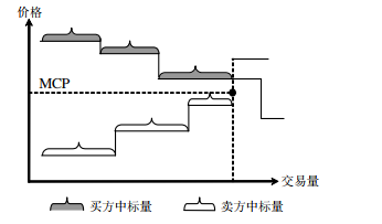 買賣雙方叫價拍賣:潛在的買方和賣方同時開價,賣方提出要價,買方提出出價。買方叫價可以看成是需求曲線,賣方叫價可以看成是供給曲線。拍賣方根據(jù)出價確定成交價格(即市場出清價MCP)清算市場:所有出價高于MCP的買方買入,所有要價低于MCP的賣方賣出;在MCP下的總供給等于總需求。