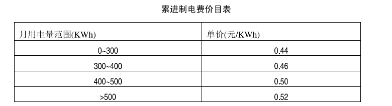 以一個(gè)典型居民用戶某月的用電價(jià)目表為例,該用戶用電量越多,其付費(fèi)壓力越大,單位電價(jià)越高。使用300度電以內(nèi)均以0.44元結(jié)算,300至400度之間以0.46元結(jié)算,依此類(lèi)推。