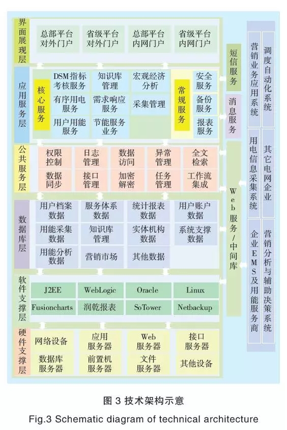 電能服務(wù)管理平臺(tái)的技術(shù)架構(gòu)如圖3所示,自下而上劃分為硬件支撐層、軟件支撐層、數(shù)據(jù)庫層、公共服務(wù)層、應(yīng)用服務(wù)層、界面展示層。