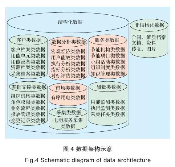 平臺(tái)數(shù)據(jù)按結(jié)構(gòu)可分為結(jié)構(gòu)化數(shù)據(jù)和非結(jié)構(gòu)化數(shù)據(jù),如圖4所示。結(jié)構(gòu)化數(shù)據(jù)包含客戶類數(shù)據(jù)、統(tǒng)計(jì)分析類數(shù)據(jù)、服務(wù)類數(shù)據(jù)、基礎(chǔ)支撐類數(shù)據(jù)、市場(chǎng)類數(shù)據(jù)、量測(cè)類數(shù)據(jù)、采集類數(shù)據(jù)等;非結(jié)構(gòu)化數(shù)據(jù)包含合同、紙質(zhì)檔案、文檔、資料、傳真、圖片等。