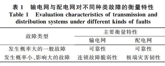 引入配電網(wǎng)韌性,是為了從總體上評估配電網(wǎng)受極端自然災(zāi)害這類低概率事件的影響程度及其應(yīng)對能力。其對配電網(wǎng)的意義,類似于連鎖故障脆弱性對輸電網(wǎng)的價值,如表1所示??梢?對于發(fā)生概率較大的常見故障(例如線路短路、單一設(shè)備損壞),配電網(wǎng)和輸電網(wǎng)都是用可靠性來衡量:配電網(wǎng)常用的可靠性指標(biāo)包括SAIDI,SAIFI以及供電可靠性是多少個“9”;輸電網(wǎng)雖然沒有計算具體指標(biāo),但是采用了N-1校驗標(biāo)準(zhǔn),用保守的運行邊界限制確保輸電網(wǎng)具有足夠高的可靠性。