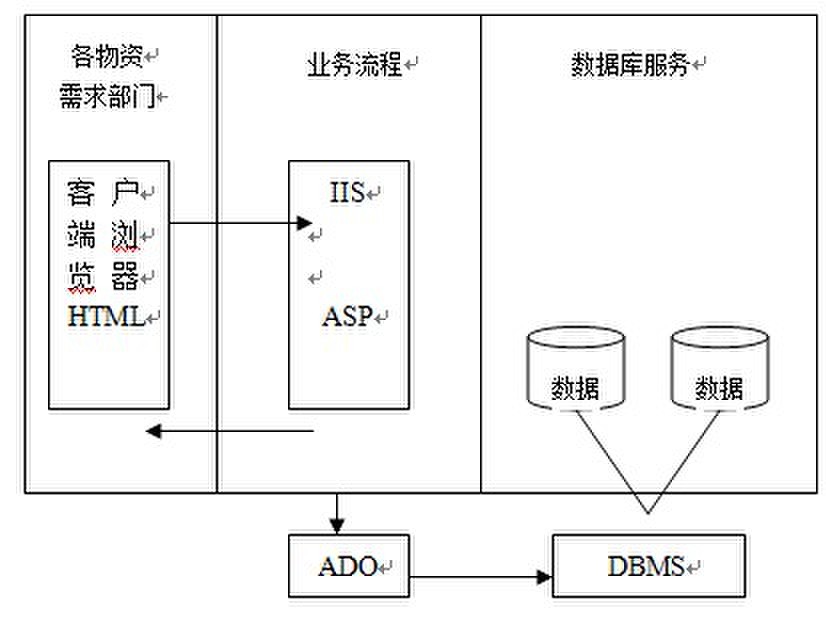 基于B/S模式的信息系統(tǒng)一般由三層構(gòu)成。第一層是用戶(hù)服務(wù),該層負(fù)責(zé)用戶(hù)界面及同用戶(hù)的交換。作為ASP程序,用戶(hù)界面是典型的HTML頁(yè)面,該層通過(guò)HTTP協(xié)議與業(yè)務(wù)層進(jìn)行通信;第二層是業(yè)務(wù)服務(wù),該層包含了在應(yīng)用程序中執(zhí)行關(guān)鍵處理的組件,這些應(yīng)用程序遵守所有的業(yè)務(wù)規(guī)則及限制,典型的業(yè)務(wù)邏輯既可以體現(xiàn)在一個(gè)簡(jiǎn)單應(yīng)用程序的ASP文件中,也可以很好地體現(xiàn)在COM組件中;第三層是數(shù)據(jù)服務(wù),該層包括含了應(yīng)用程序的數(shù)據(jù),這些數(shù)據(jù)駐留在數(shù)據(jù)庫(kù)中。如下圖所示