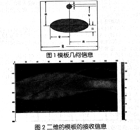 在正方形托盤上放置兩個均勻固體介質組成的標定模板,模板的幾何信息如圖1所示。每一點的吸收強度相同,模板是均勻介質。假設探測器單元均勻分布,各探測器間距離相等,在第151次掃描結果中,第223個接收器,接收到了最弱的X射線信號,即衰減最強的信號。在第151次掃描結果中,此時的第223個接收器的射線與橢圓長軸重合,該時刻第278個到第168個與第74個到第46個接收器之間有效的接收到了信號,其中第278個到第168個接收器接收到的信號對應大橢圓的短軸,短軸長度30mm,第74個到第46個接收器接收到的信號對應小圓的半徑,半徑長度為8mm。由此可以推算出接收器的距離為0.2714mm(兩組數據平均值)。