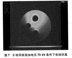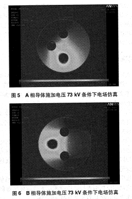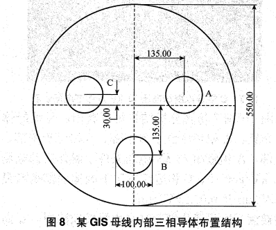由圖4-圖7仿真分析結(jié)果可以看出,母線導(dǎo)體采用斜三角布置,A相導(dǎo)體位于最下部、B相位于中部、C相位于上部,A相施加73 kV電壓條件下罐體底部電場(chǎng)強(qiáng)度為5.15 kV/cm,B、C相運(yùn)行電壓下罐體底部電場(chǎng)強(qiáng)度為0.073 kV/cm及0.012 kV/cm。