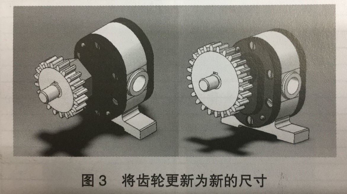 上述程序在運(yùn)行前,首先需更改一個(gè)零部件的尺寸,然后進(jìn)行“自動裝配”操作,程序會自動將橫板相對應(yīng)的文件更新為當(dāng)前新的零最后更新裝配體,就實(shí)現(xiàn)了自動裝配。如果要更新其它零部件,上述操作,即可得到新的裝配體。圖3為更新齒輪后前后對比。