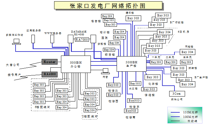 張家口發(fā)電廠MIS網(wǎng)絡是一個負責全廠生產(chǎn)應用、辦公管理、信息傳遞的基礎平臺,它在1999年投入運行,主干由NORTEL公司的二臺5000BH大型交換機構成,后臺是COMPAQ公司的ALPHA4100小型機,中心路由器是NORTEL的5782路由模板。整個網(wǎng)絡冗余性比較好,唯一無法實現(xiàn)冗余的就是路由器。這其中有初次投資的資金問題,也有部分技術問題。整個網(wǎng)的拓撲結構如下圖: